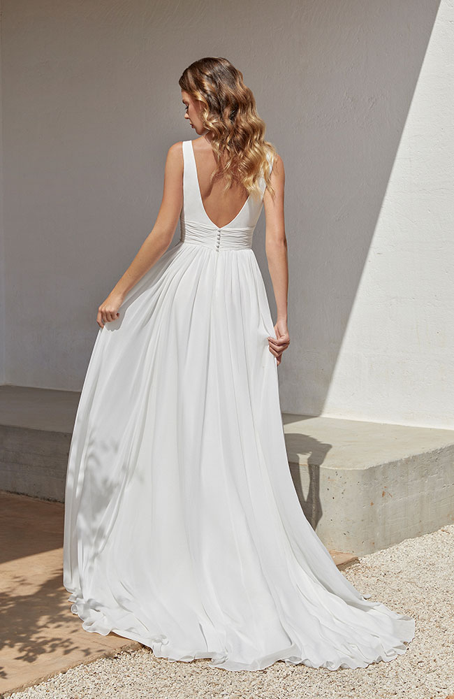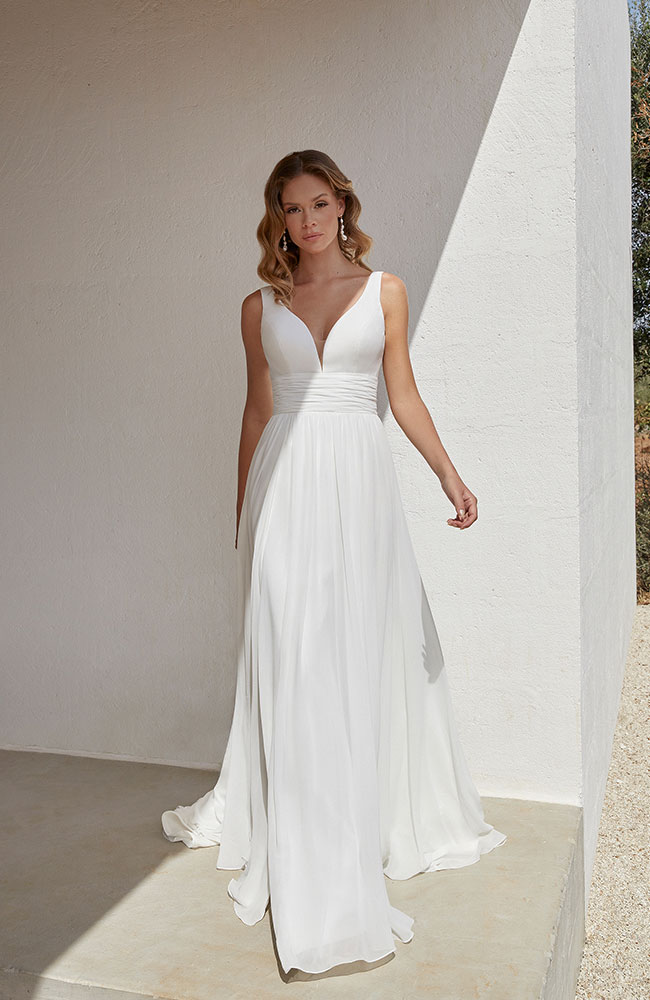 Élégante et moderne, la robe Aggie séduit par son décolleté en V, son dos plongeant et sa taille drapée qui sublime la silhouette. Sa jupe fluide avec une fente subtile offre légèreté et mouvement, idéale pour un mariage en plein air ou en bord de mer. Une robe alliant simplicité et charme intemporel.