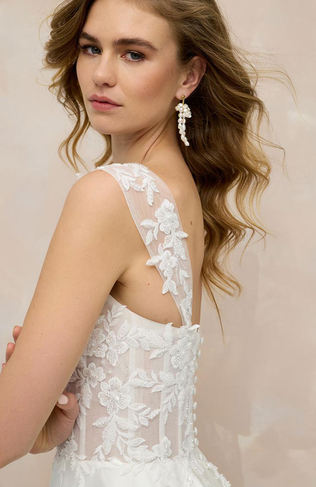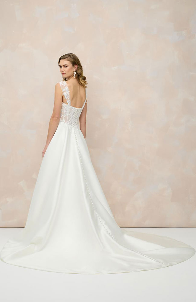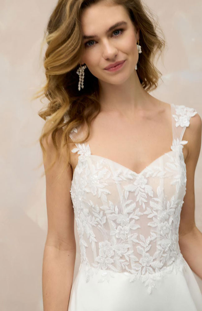 Ana est une robe de princesse élégante avec une jupe évasée en mikado et une superbe traîne chapelle. Le corsage structuré présente un décolleté en cœur et un dos ouvert. Le corsage et les bretelles amovibles sont ornés d’appliqués floraux ivoire avec des touches de perles.